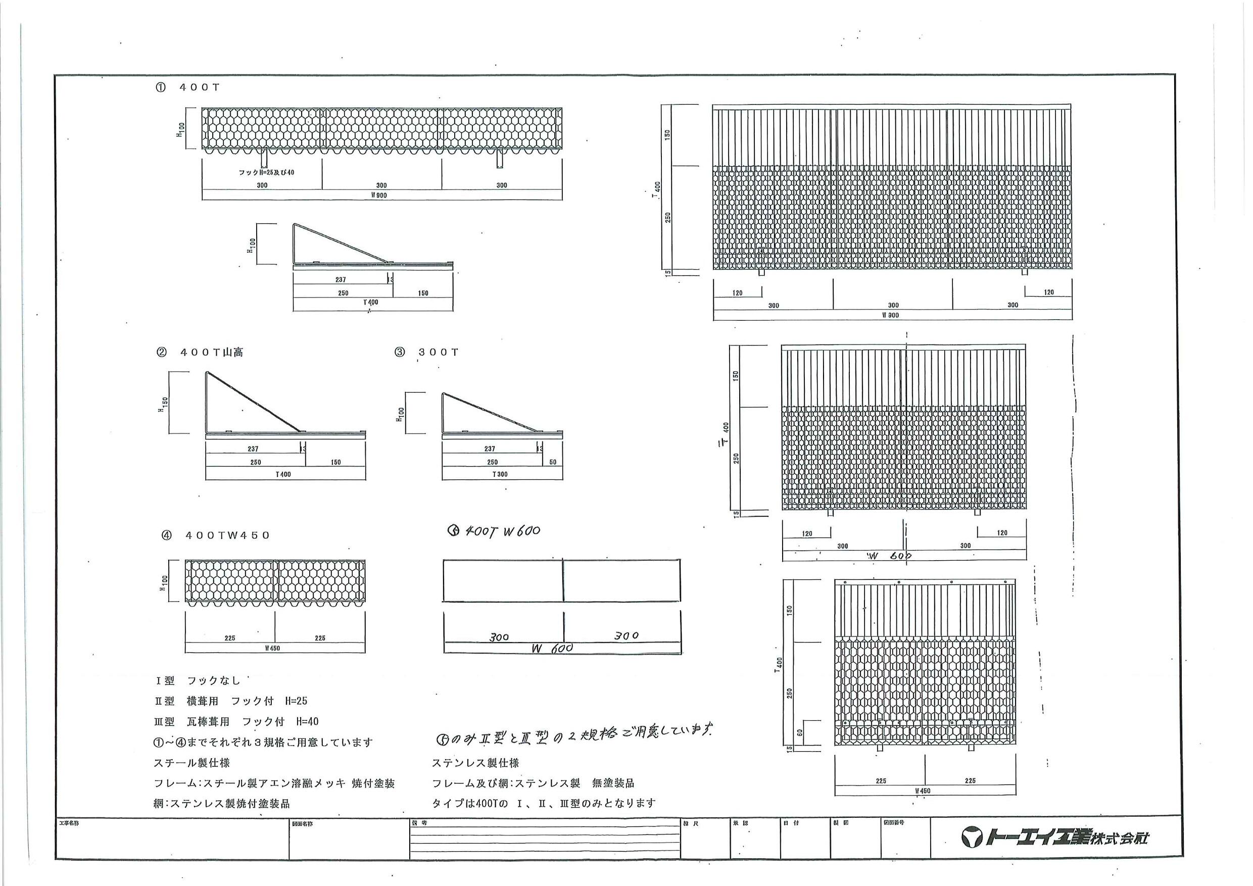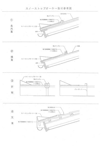 service スノーストップオーケー製品一覧 製品一覧400Tタイプ400T-1型400T-2型400T-3型400T 山高タイプ400T-1型(山高)400T-2型(山高)400T-3型(山高)300Tタイプ300T-1型300T-2型300T-3型400T W450タイプ400T-2型(W450)400T-3型(W450)400T W600タイプ600T-2型(W600)600T-3型(W600)400Tタイプ(SUS製)400T-1型(SUS製)400T-2型(SUS製)400T-3型(SUS製) 概要・寸法スノーストップオーケーの概要と寸法をのせていますので、屋根に設置する際の参考にしてください。 施工前・施工中・施工後の注意点とメンテナンスについて 取付け方法